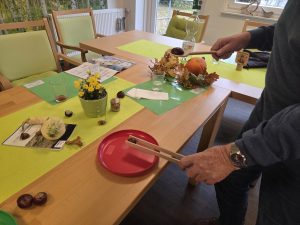 Doch damit nicht genug. In der nächsten Etappe war Fingerfertigkeit gefragt. Mit einer Speisezange sollten Kastanien von einem Teller auf den anderen wandern 🌰➡️🌰. Da sprang schonmal die ein oder andere Kastanie quer durch den Raum 🙃. Machte aber nichts! Es waren ja genügend Helfer da, die beim Aufheben geholfen haben. Zudem fördert so ein Fingerspiel auch die Feinmotorik 👍👐.
