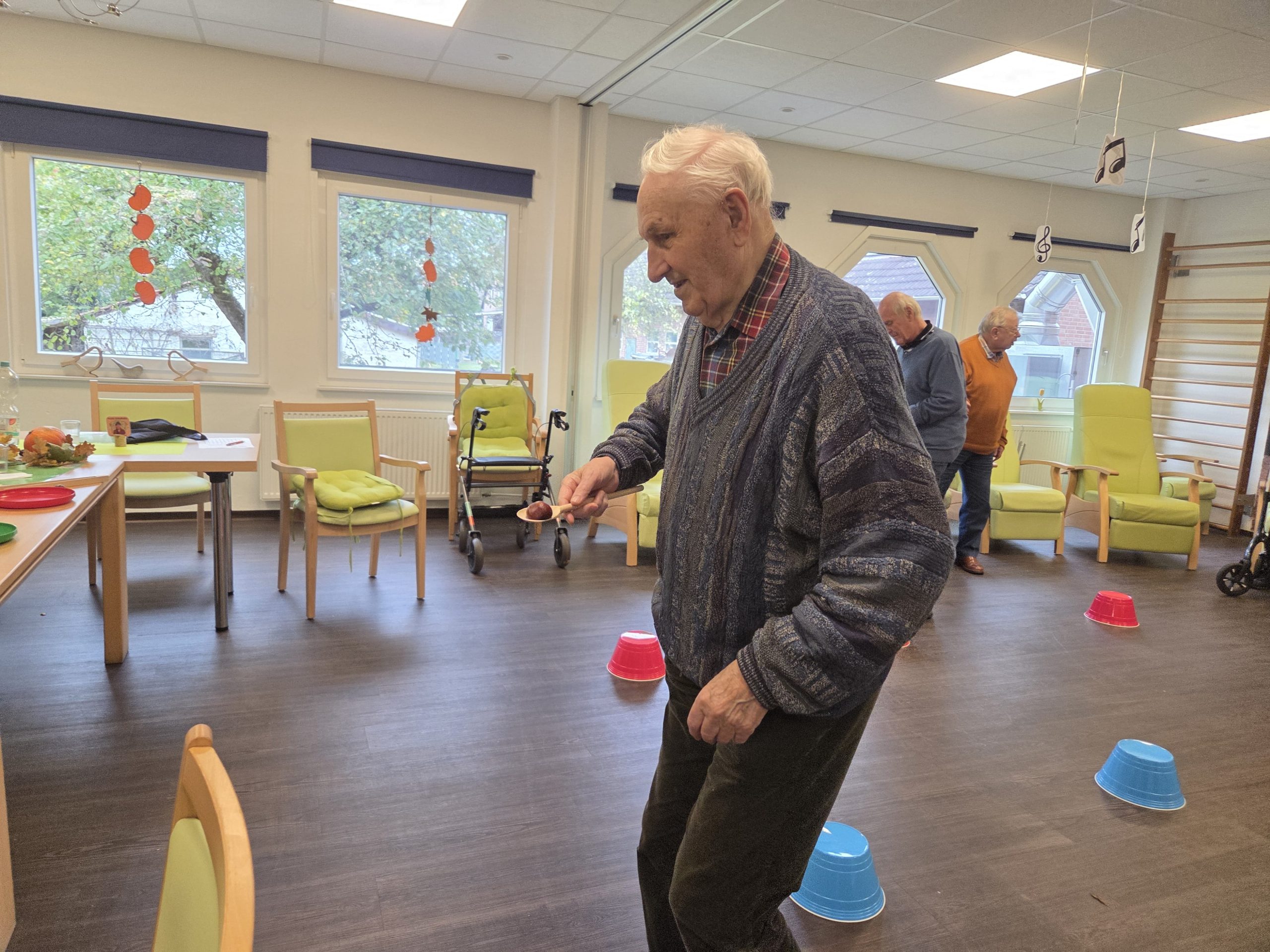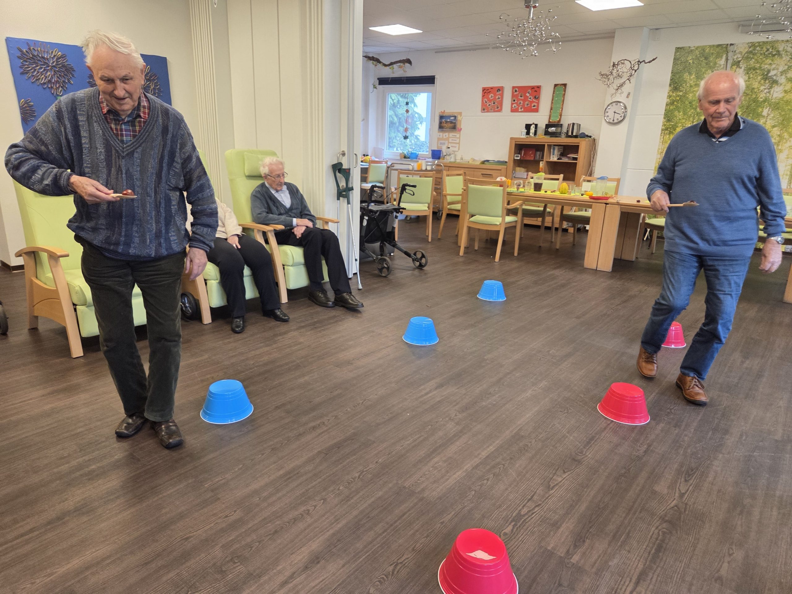 Unsere Tagesgäste sind mit überraschender Geschicklichkeit und ungewohnt ehrgeizig gegeneinander angetreten und schlängelten sich beherzt zu Fuß oder mit dem Rollator um bunte Hütchen 🚶‍♂️🚶‍♀️.