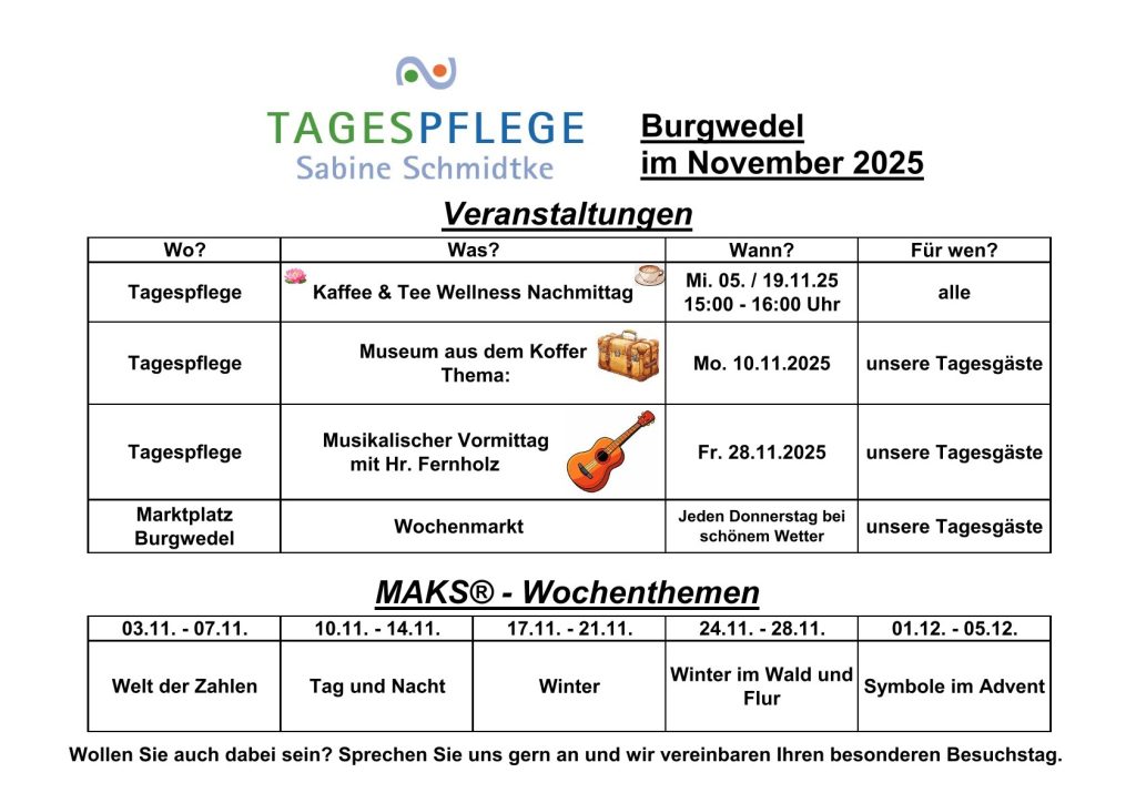 Auch in diesem Monat haben wir wieder viele schöne Aktionen vorbereitet. Vom herbstlichen Basteln über Musikrunden bis hin zu gemütlichen Spielenachmittagen. Auch die liebe Frau Brandes mit ihrem Museum aus dem Koffer besucht uns wieder. In unseren Tagespflegen wird es also garantiert nicht langweilig 💚🧡!